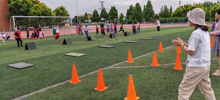 7—9岁的小朋友们于操场草坪南侧参加“加油向前冲”活动,该关卡障碍重重,通过和家长的默契配合,小勇士们没有一个中途放弃,纷纷到达终点。